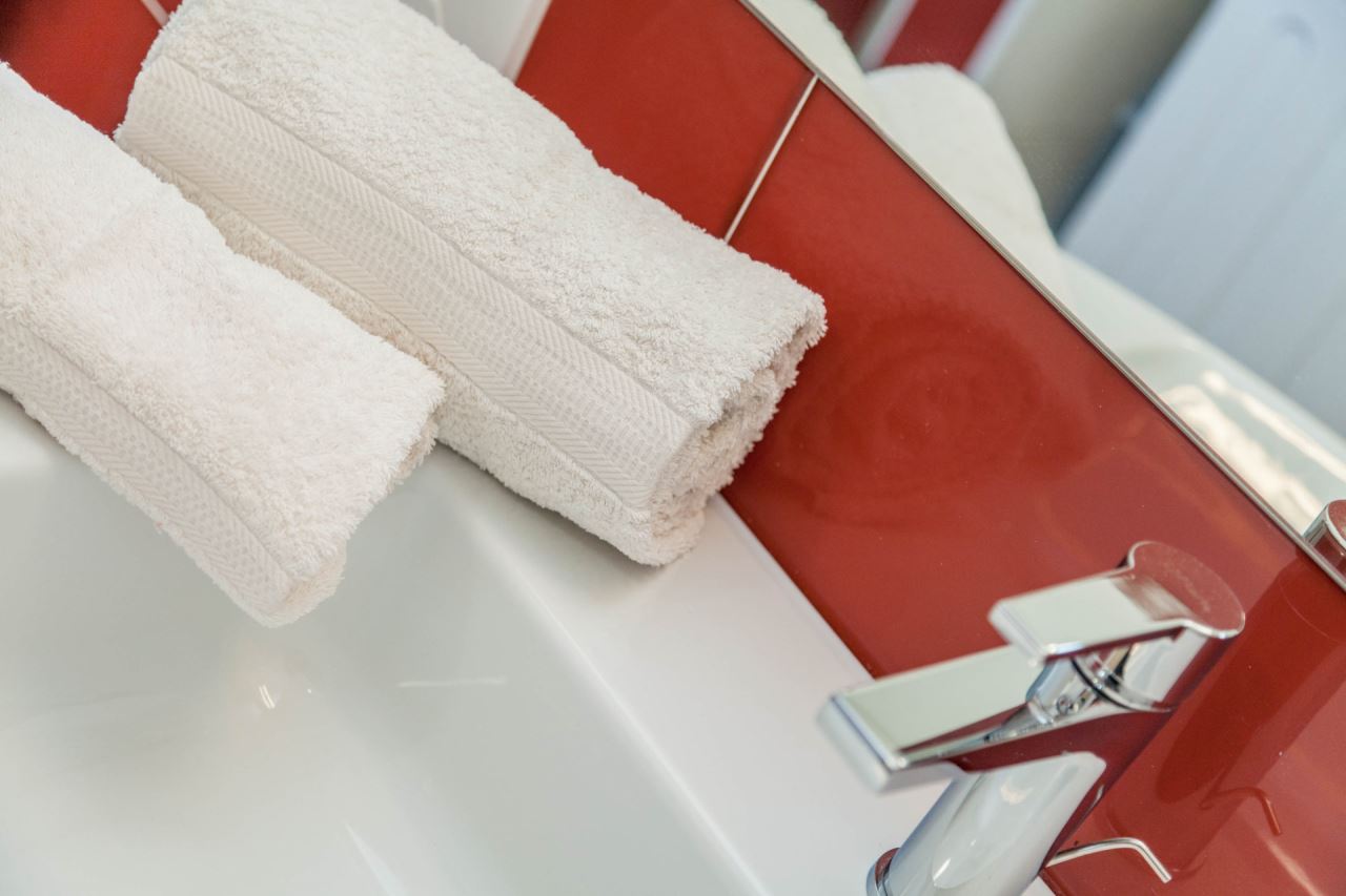 Gli interni sono suddivisi in 2 camere da letto (1 matrimoniali e 1 doppia con letti gemellabili), un soggiorno, con zona cucina e 2 divani letto singoli, e un bagno con doccia.